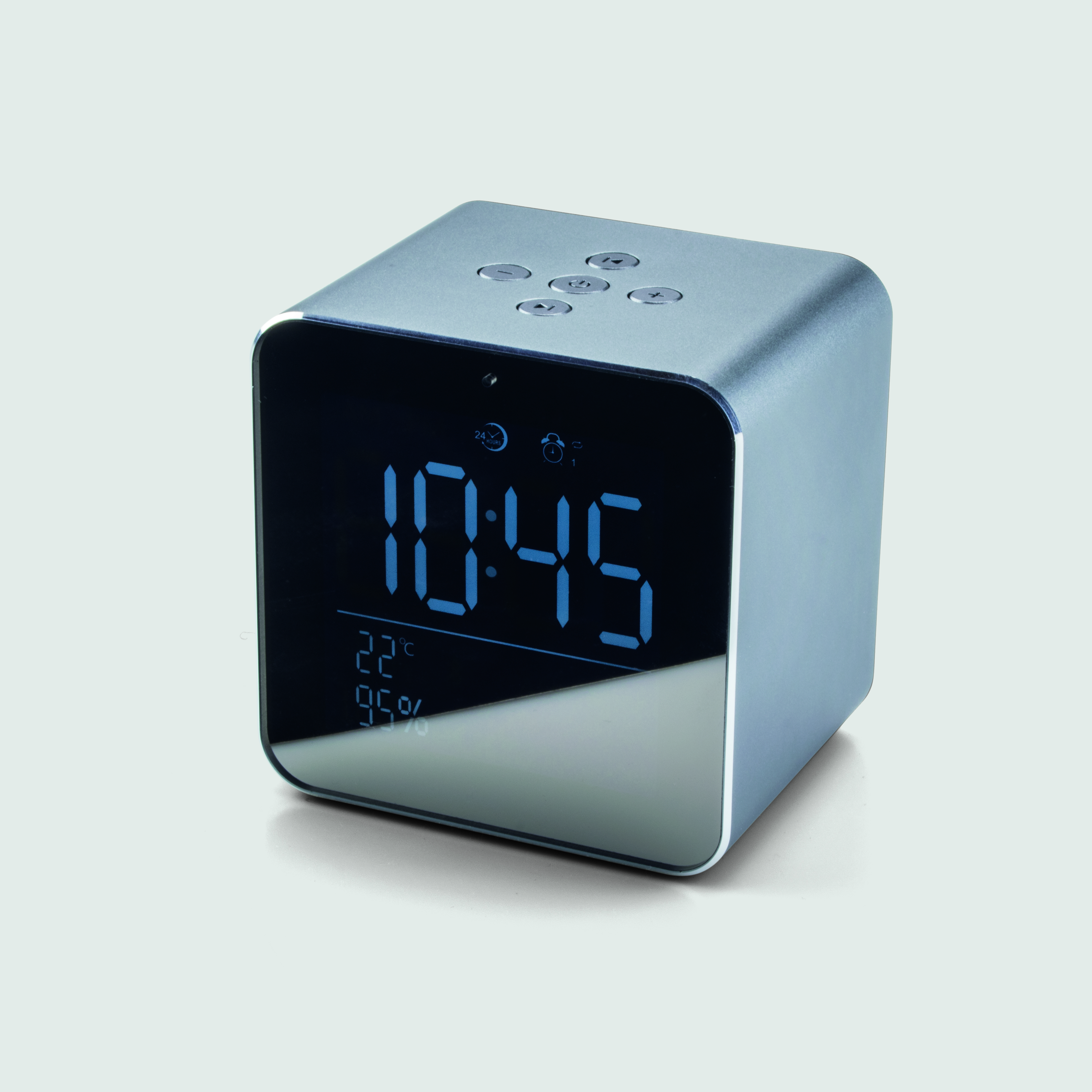 Daewoo Bluetooth speaker with 5W power. It has open listening, LCD screen with time and temperature, alarm, rechargeable battery, micro SD and aux-in ports.